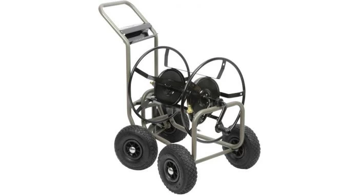 Zeer robuuste slangenwagen met metalen framewerk voorzien van slijtvaste polyester epoxylak. Deze zeer stabiele slangenwagen is uitgerust met 4 luchtbanden (ø 260 mm) en is geschikt voor intensief, zwaar en zeer zwaar gebruik. De dwarsgeplaatste grote trommel heeft een capaciteit voor 135 m 12,5 mm / 120 m 15 mm of 85 m 19 mm slang, is zeer soepel op.- en afrolbaar en beschikt over een meedraaiende slangaansluiting waardoor een continue watertoevoer in elke positie kan worden gegarandeerd. Dankzij de blokkadefunctie op de trommel wordt ongewenst afrollen van de slang voorkomen. Uniek voor dit model is de 2 wiel – stuurfunctie die ervoor zorgt dat de wagen tijdens gebruik niet opgetild hoeft te worden om een bocht te kunnen maken, met de maximale capaciteit slang, en gevuld met water kan het gewicht van de slangenwagen namelijk wel oplopen tot 40 kg. Voor extra comfort tijdens gebruik is dit model uitgerust met een metalen accessoirerekje voor het opbergen van sproeigereedschap, daarnaast wordt deze wagen geleverd met 2 duurzame koperen koppelstukken ø 15 / 19 mm.