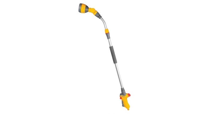 Telescopische lansproeier Plus 140. Uitvoering: Lange telescopische steel uitschuifbaar tot 140 cm. Verstelbare kop met zeven sproeistanden: jet, kegel, snelvulstand, platte straal, nevel, fijne broes en zuurstof verrijkend sproeien. Vergrendelbare trigger met instelbare watertoevoer en afzonderdelijke doorstroomregeling.